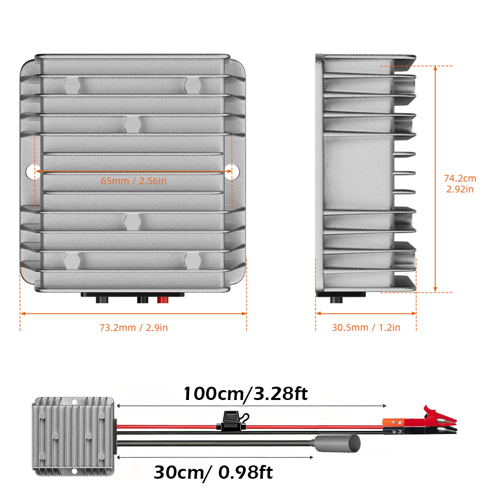 • Input Lead: 14 AWG × 1 m pigtail with 20 A inline fuse (mount fuse close to battery positive terminal)