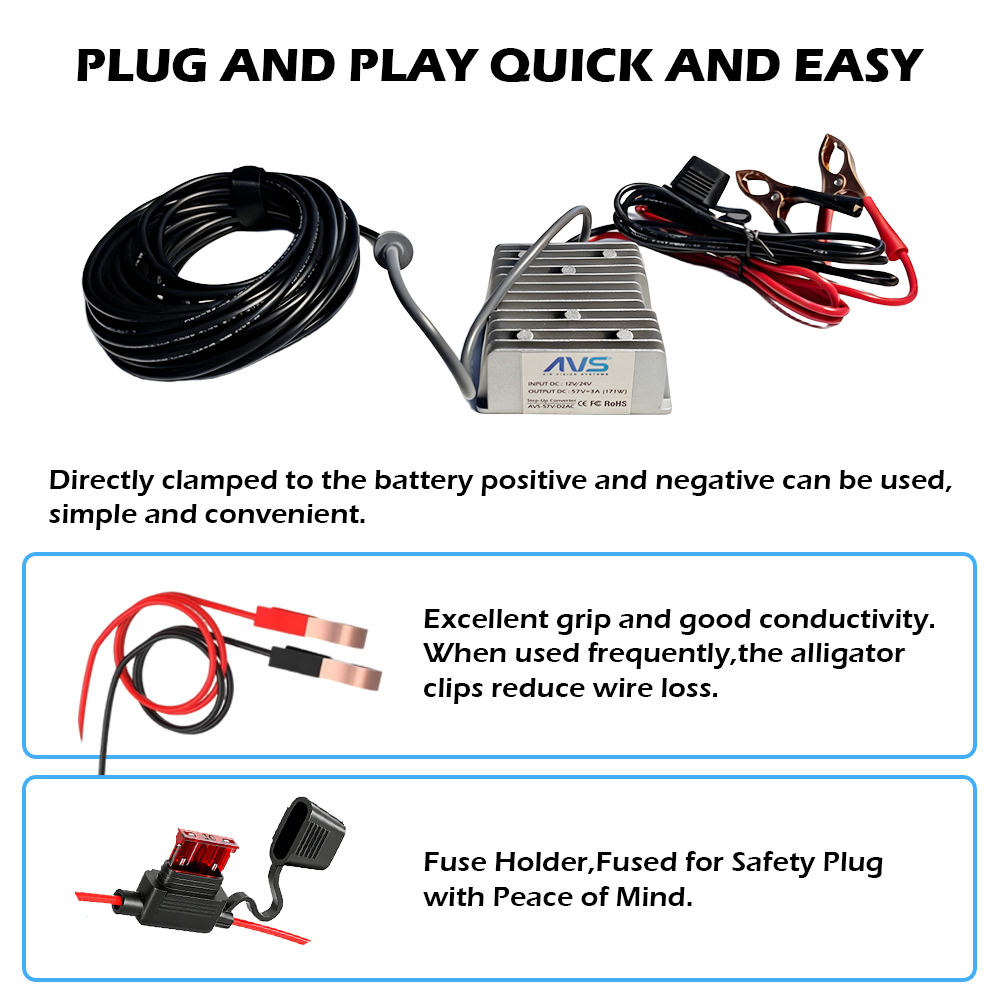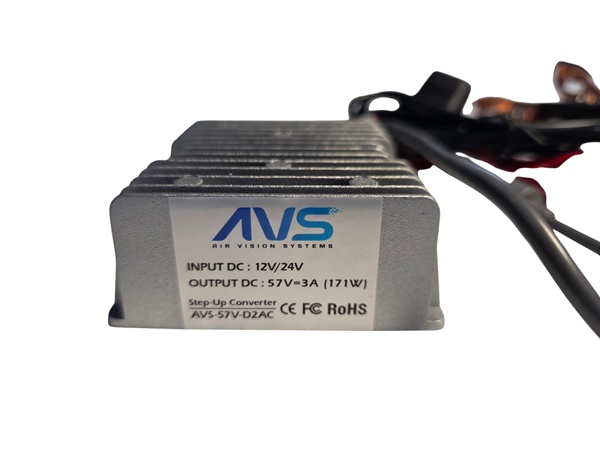 12 V or 24 V to 57 V Step-Up Converter with fused alligator-clip battery connection and waterproof DC female output. Delivers 171 W for Starlink Gen 3 – ideal for vehicles, marine, and off-grid power systems.  (Starlink and DC to DC cable not included)
