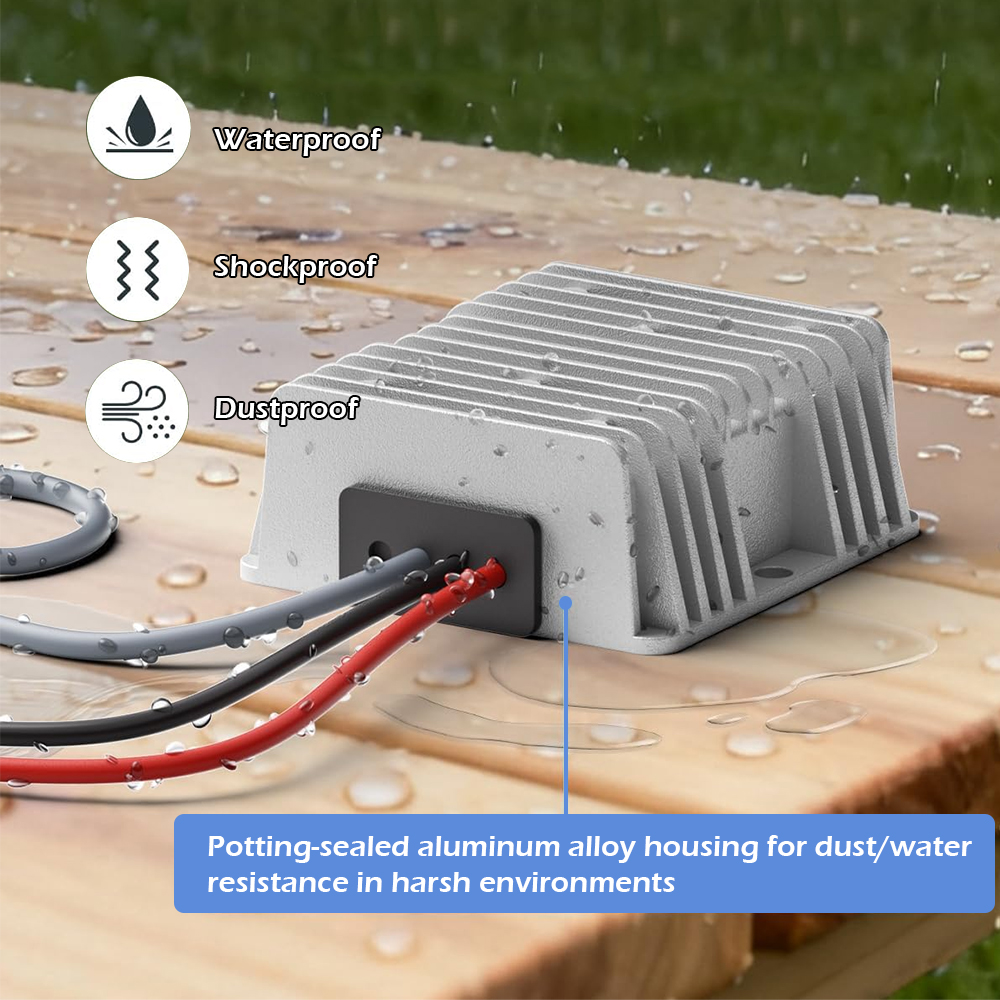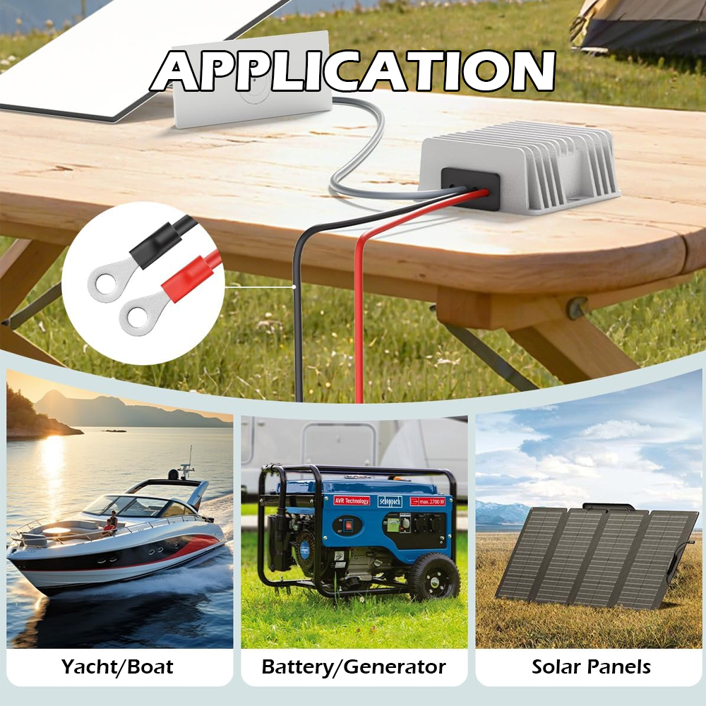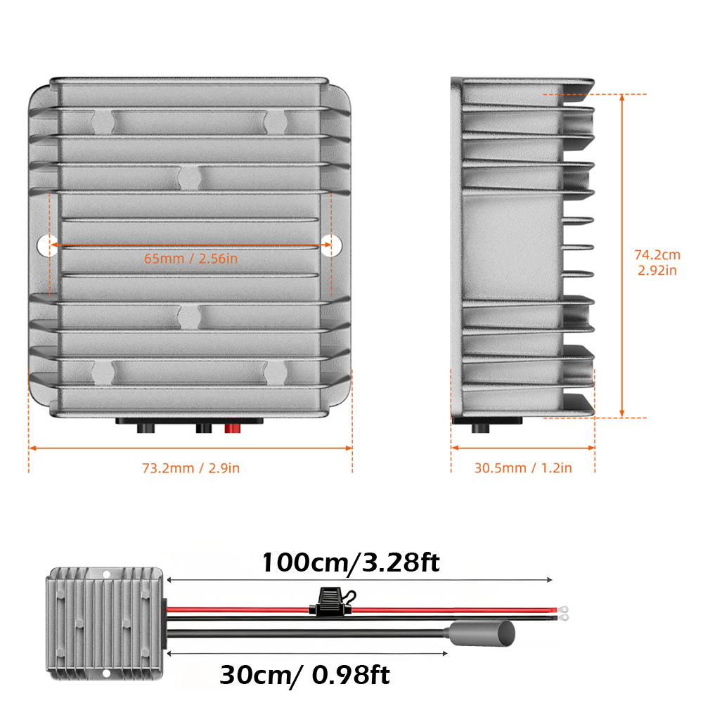 • Input Lead: 14 AWG × 1 m pigtail with 20 A inline fuse (mount fuse close to battery positive terminal)