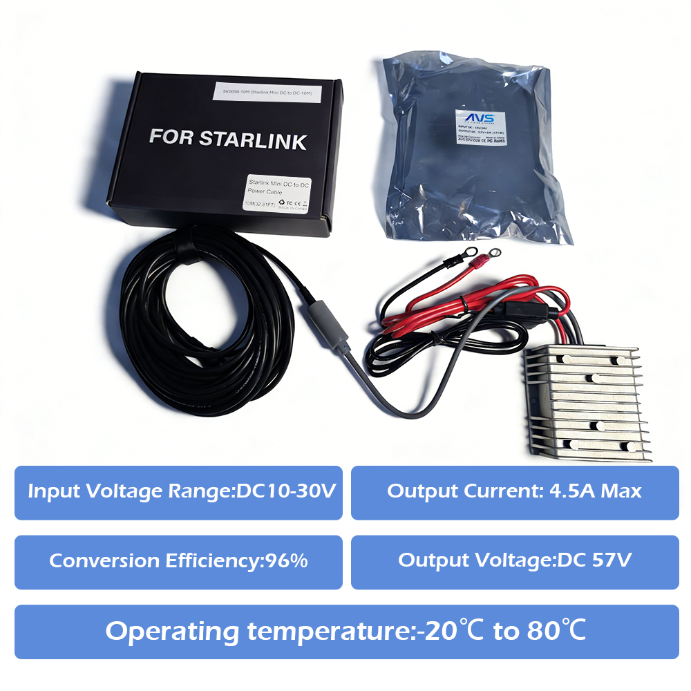 • Cable Compatibility: Works directly with AVS Starlink DC-to-DC Cables (2 m – 15 m lengths) to the Starlink Gen 3 router.