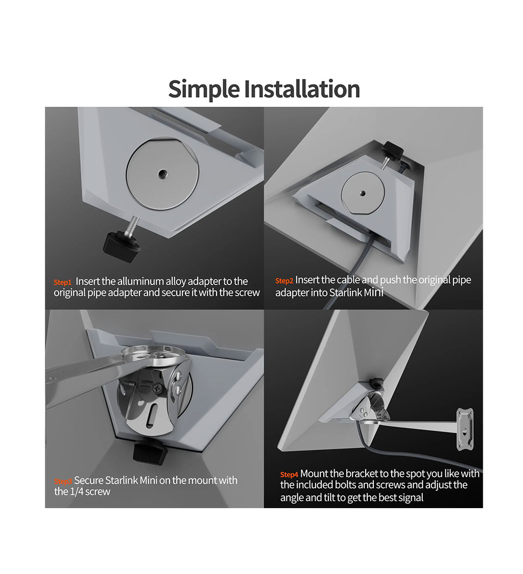 This adjustable bracket allows for versatile positioning, enabling you to achieve the best possible signal reception. Users can easily adjust both the horizontal and vertical angles up to 150 degrees, ensuring optimal alignment of the Starlink Mini dish for a strong and stable connection.
