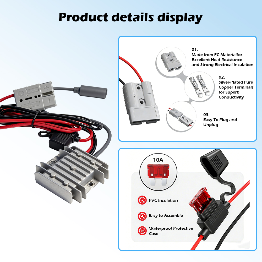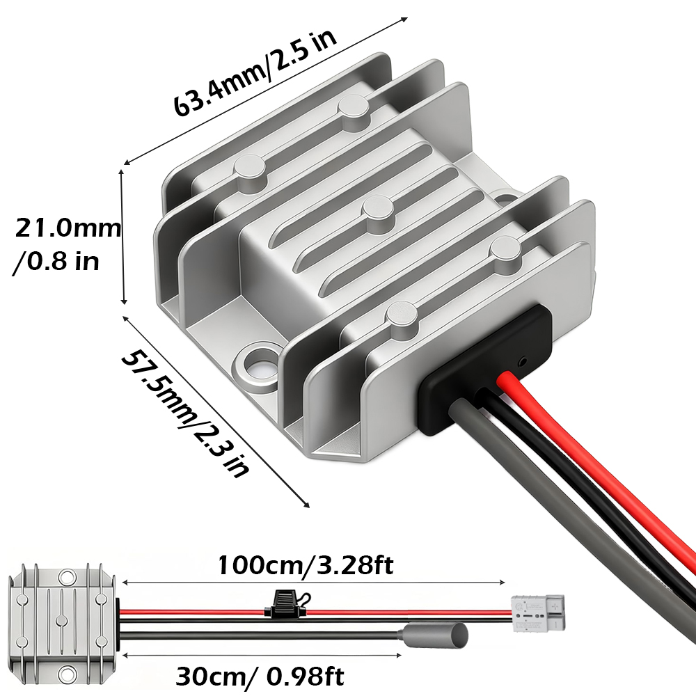 - Input Lead: 14 AWG × 1 m pigtail with 10 A inline fuse (fuse close to battery positive terminal)