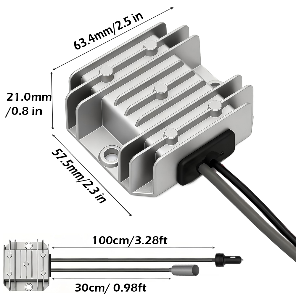 - Input Lead: 16 AWG × 1 m pigtail with 10 A inline fuse (fuse close to battery positive terminal)